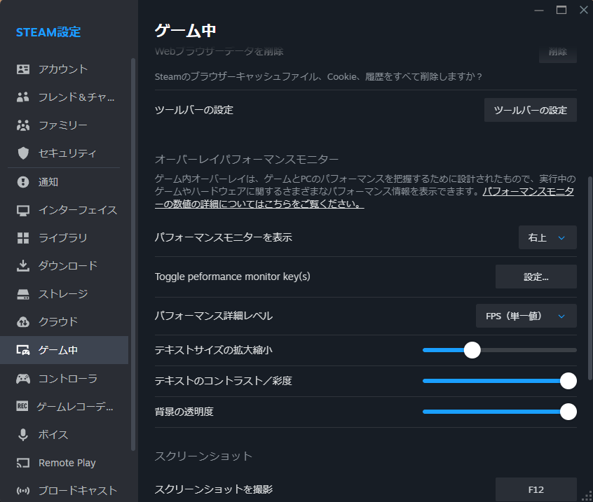 - Steamを再起動し、「設定」→「ゲーム中」→「パフォーマンスモニターを表示」